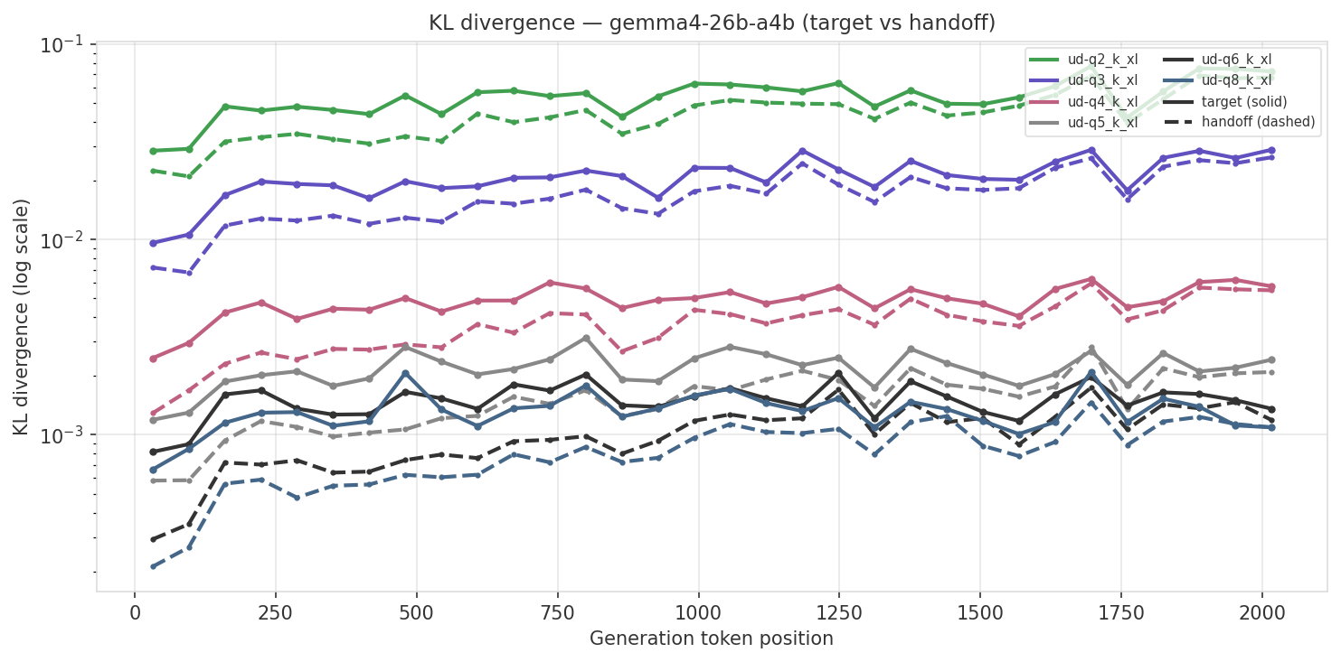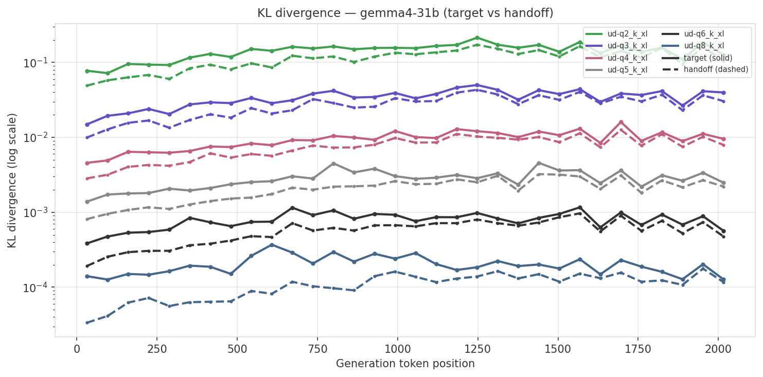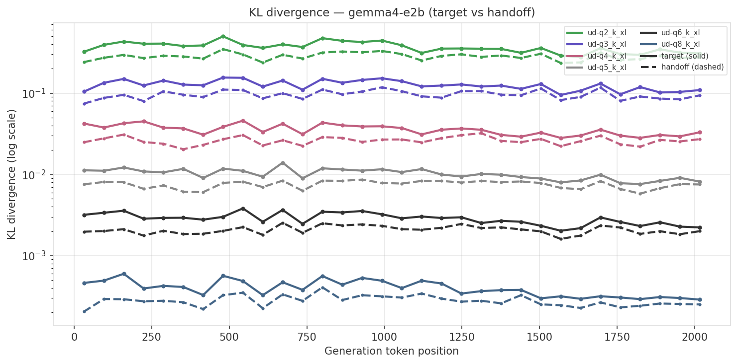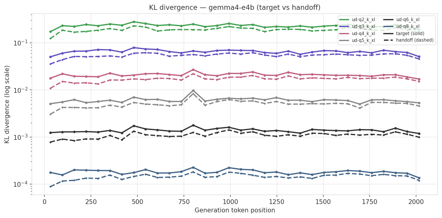 The charts below show absolute KL divergence (log scale) across generation position. Solid lines are target (no transfer), dashed lines are handoff (with KV cache transfer). Each color is a different quant level.